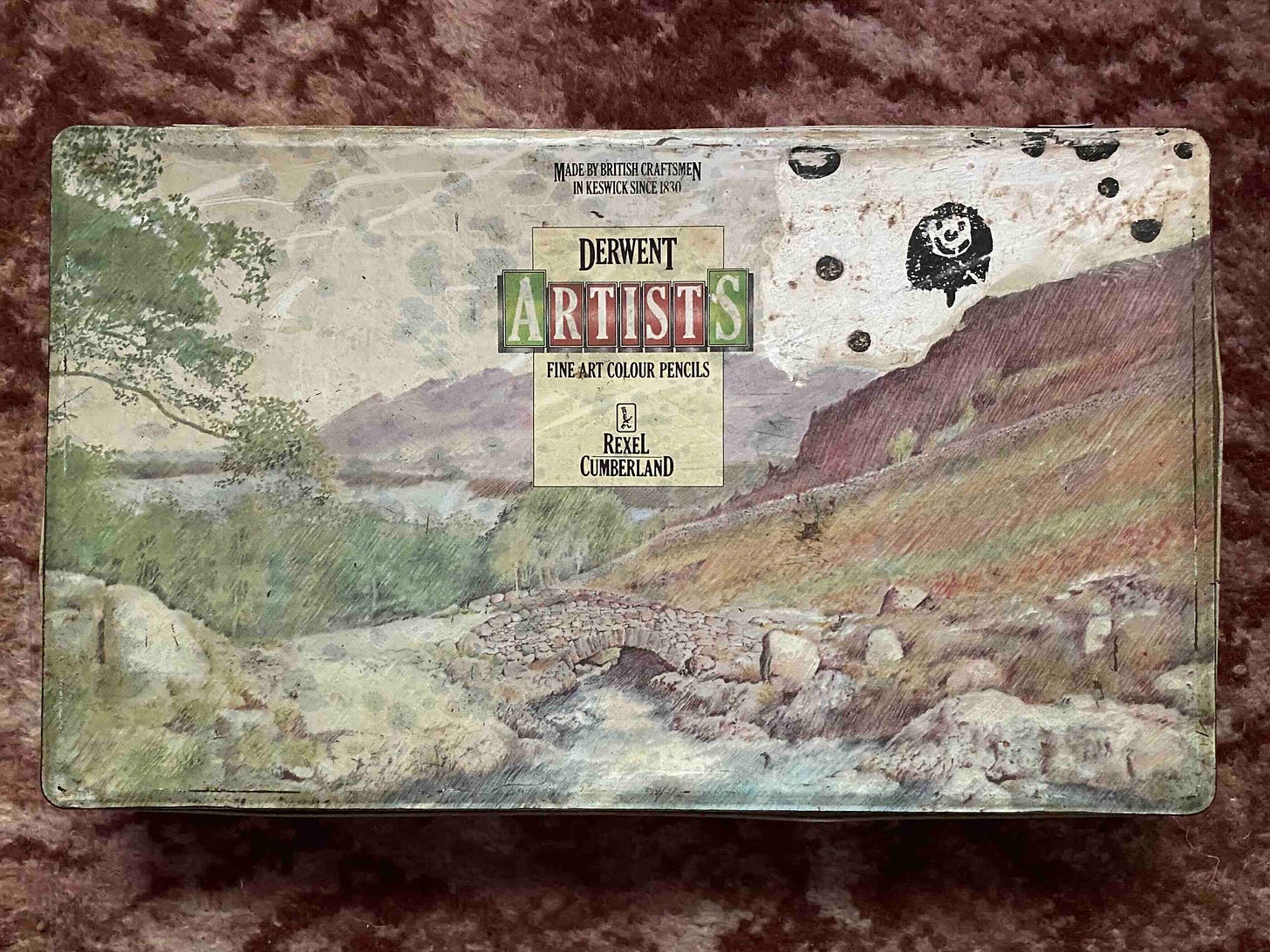 I’ve kept this tin of 72 Derwent coloured pencils since I was given them as a child. Then, they made me feel as if I had the power to make anything I wanted to, and I enjoyed the descriptive names of the colours etched into the pencil in gold: Rose Madder Lake, Kingfisher Blue, Burnt Carmine. The shortest of the pencils in my tin, the ones which must have seen the most use, are black, white, and Jade Green. Some of the Derwent colours are so distinct that they have become reference points for me: Emerald Green the colour of grass in a cartoon, and Magenta, a colour exactly on the edge of red and blue.